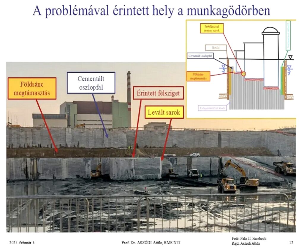 „2025.01.15-én a déli falon a megerősített talajban a 81,15 mBf és 74,00 mBf közötti szinten repedéseket észleltek. Ezt a területet elkerítették, biztonsági zónát szerveztek és geodéziai ellenőrző pontokat helyeztek el (mellékelt fotó). 2025.01.30-án a megerősített talaj egy része beomlott a repedés kialakulásának területén (mellékelt fénykép).” Egyúttal „felszólítja Paks II. Zrt.-t, mint Engedélyest, hogy az 5. blokk munkagödre déli falának beomlással érintett szakasza, valamint a munkagödör ezen kockázattal érintett valamennyi területe tekintetében haladéktalanul állítsa le a munkavégzést, és tegye meg a szükséges óvintézkedéseket.”